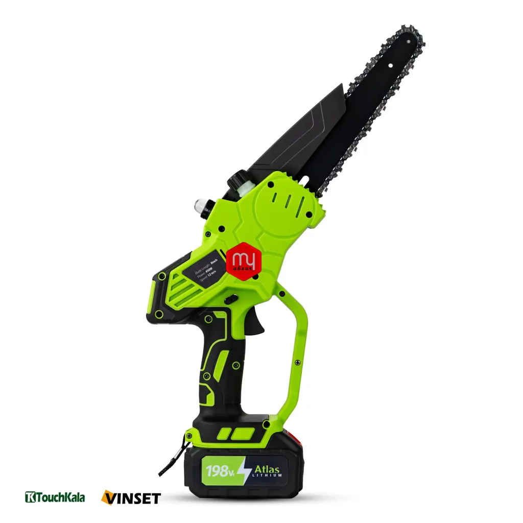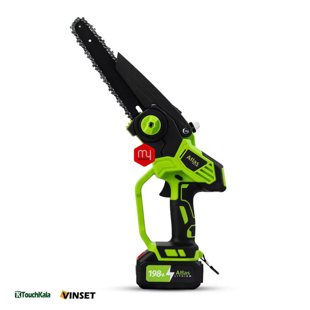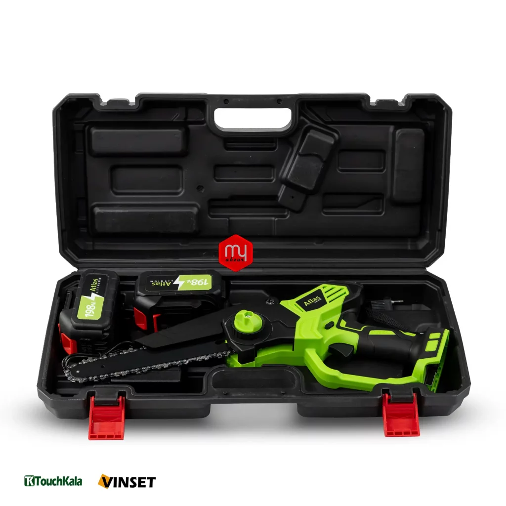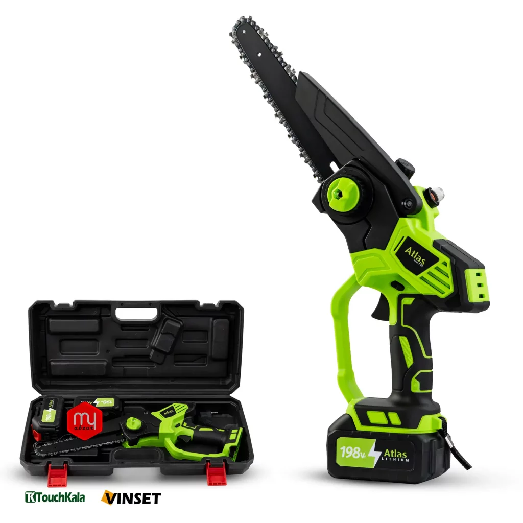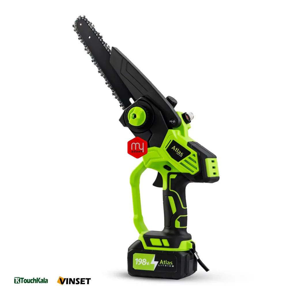 اره زنجیری شارژی اطلس تیغه 20 سانتی با باطری لیتیوم 198 ولت 2 آمپر ساعت، مناسب برای برش و هرس شاخه ها میباشد.